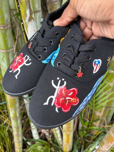 Hermosas tenis dedicadas a mi hermosa islita de Puerto Rico. Esta creación combina el arte sublimado con arte pintado a mano. Son cómodos y super livianos. INFORMACION IMPORTANTE: La venta de este calzado se hara de manera virtual por lo tanto te recomiendo que verifiques la tabla de tamaños en pulgadas. El tamaño de los calzados puede variar así que mide tu pie (ancho/largo) y ve a la tabla de tamaños para que asegures que ordenas el calzado que se ajuste mejor a ti. NO HABRA DEVOLUCIONES O CAMBIOS POR SIZE DE CALZADO.