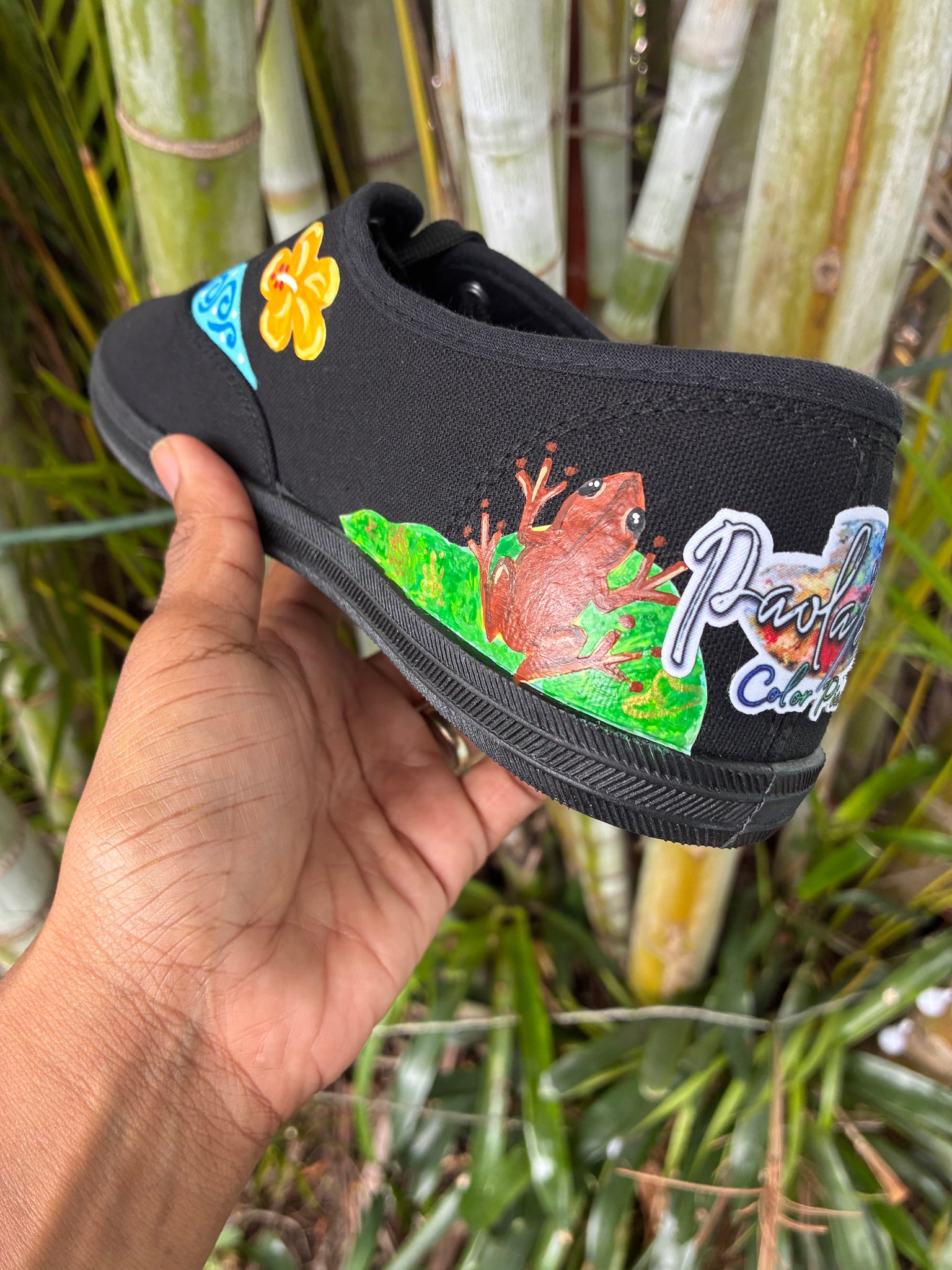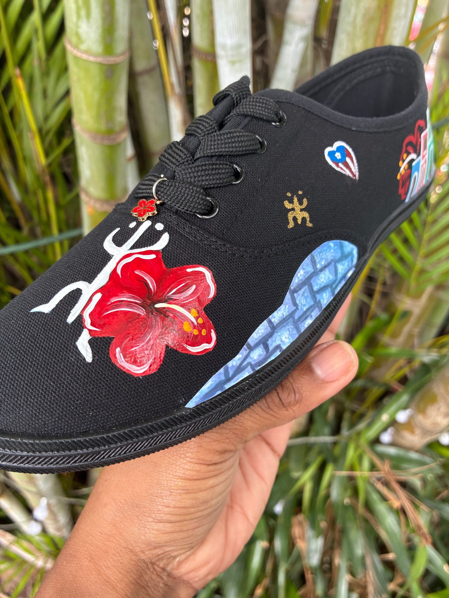 Hermosas tenis de lona negra con diseños alusivos elementos y cultura puertorriqueña. Esta creación combina el arte sublimado con arte pintado a mano. Son cómodos y super livianos. INFORMACION IMPORTANTE: La venta de este calzado se hara de manera virtual por lo tanto te recomiendo que verifiques la tabla de tamaños en pulgadas. Este calzado NO corre regular, estas corren pequeñas (ejemplo: si eres 9 regular te corresponde size 10). Tambien puedes ir a la tabla de tamaños para que te asegures que ordenas el calzado que se ajuste mejor a ti. NO HABRA DEVOLUCIONES O CAMBIOS POR SIZE DE CALZADO. NO MOJAR CALZADO. ENVIO GRATIS PARA PUERTO RICO. Tenis son trabajadas por pedido.